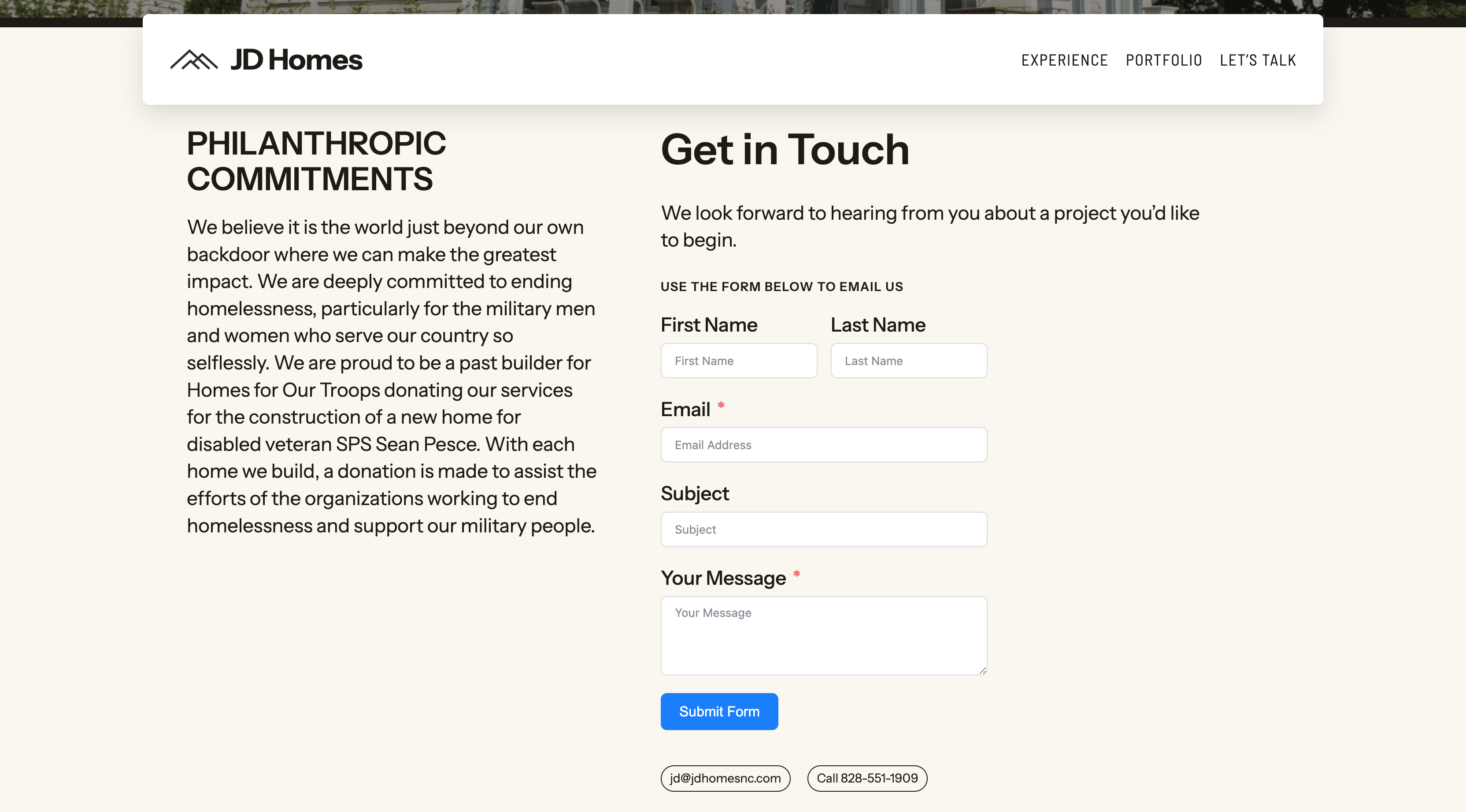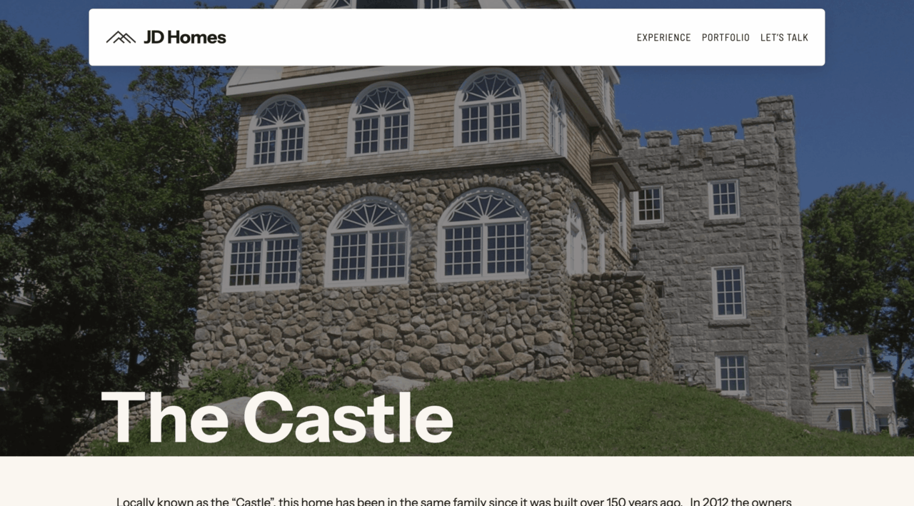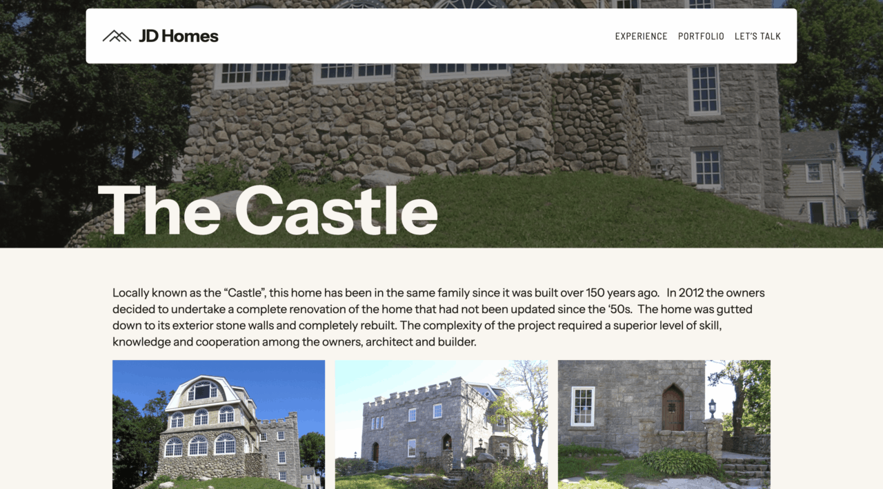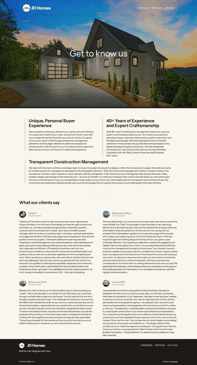 JD Homes is a luxury residential design and construction firm specializing in custom homes built with meticulous attention to detail and enduring materials. This site was built using a custom child theme of the standard WordPress TT5 (Twenty Twenty-Five) theme, providing excellent semantic markup, longevity, and performance. The site showcases their portfolio of custom homes, client testimonials, and their unique construction management approach.